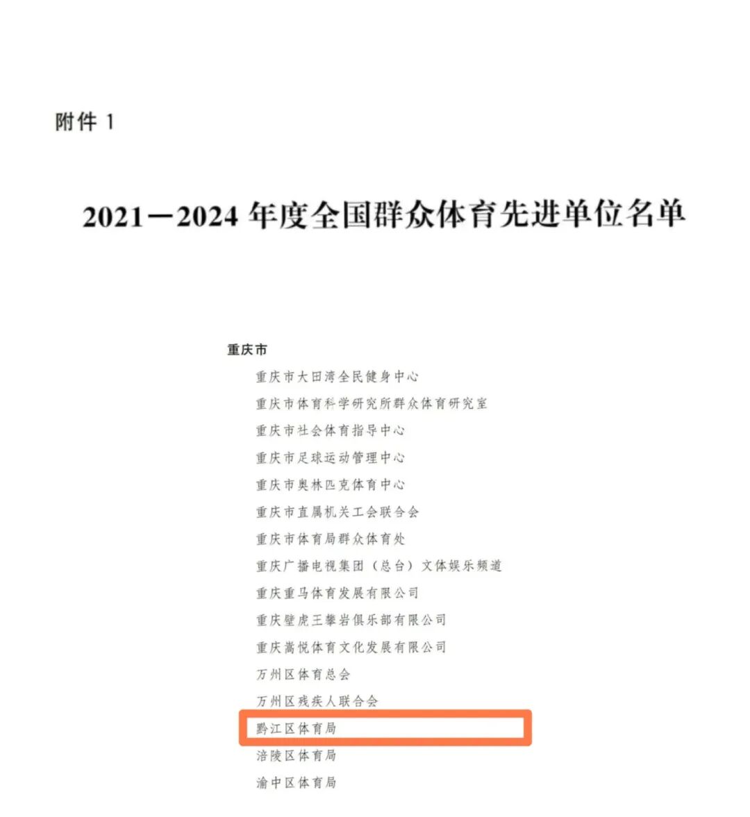 喜报近日,国家体育总局授予重庆市黔江区体育局“2021-2024年度全国群众体育先进单位...